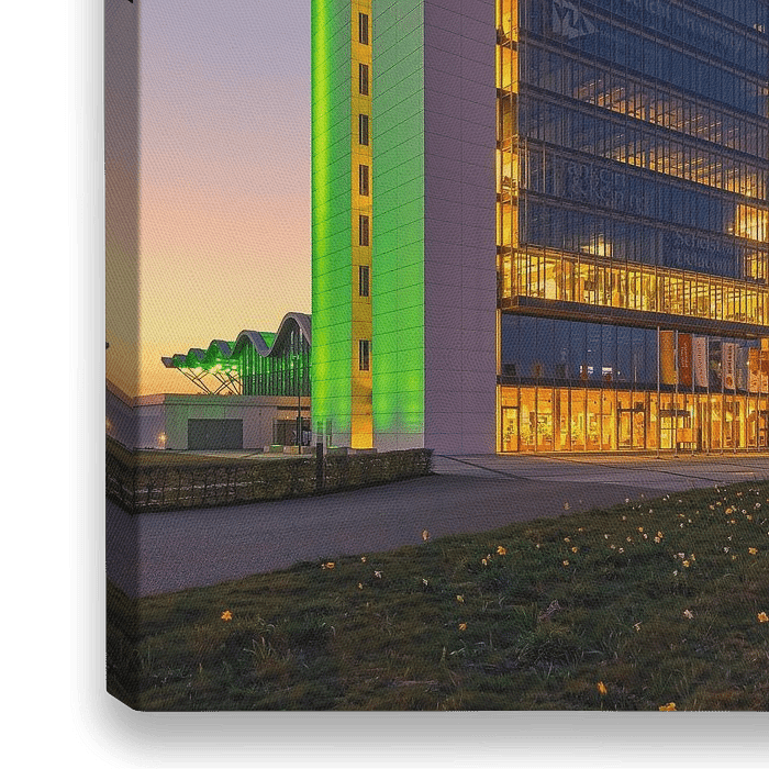 Ein vertikales 4:5-Foto eines Abends nach Sonnenuntergang in der Abenddämmerung an den beleuchteten Innovatoren, einem modernen Bauwerk in Venlo in der niederländischen Provinz Limburg und einem der Campusgebäude des Brightlands Campus Greenport.