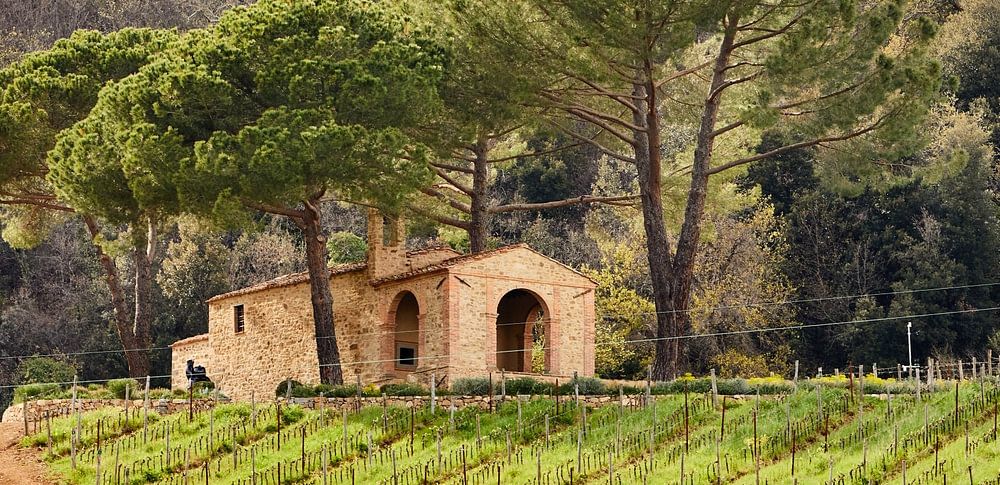 Eine kleine sandfarbene Kapelle sitzt bequem auf einem grünen Weinberg und wird von genügend Bäumen überdacht, um eine Pause von der Sonnenhitze zu bieten.