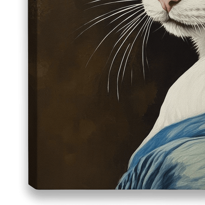 Dieses humorvolle Ölgemälde ist eine skurrile Variante von Vermeers Das Mädchen mit dem Perlenohrring und ersetzt das Gesicht des Mädchens durch das eines ausdrucksstarken Corgis. Die weiße Katze mit den kultigen Ohren und dem verspielten Grinsen trägt das bekannte Kopftuch und den übergroßen Perlenohrring und verbindet klassische…