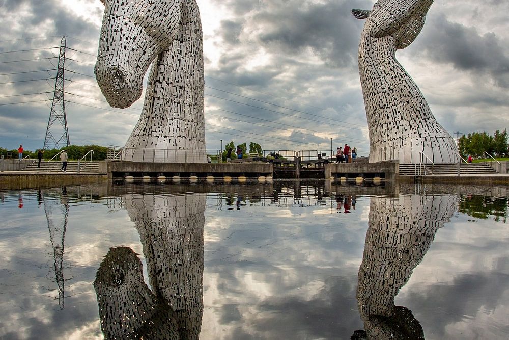 Ein Foto von den Kelpies, einem Kunstwerk mit zwei riesigen Pferdeköpfen in der Nähe der Stadt Falkirk in Schottland. (in der Nähe von Edinburgh) Die Statuen sind 30 Meter hoch und werden nachts von innen mit verschiedenen Farben beleuchtet. Dieses Foto wurde auf dem Bauch liegend mit einem Fischaugen-Objektiv aufgenommen, damit sie beide passen. Das Wasser vor ihnen gibt eine schöne Reflexion auf diese Weise.