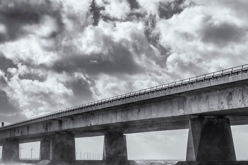 Die Ketelbrug, die Ost-Flevoland mit dem Noordoostpolder in den Niederlanden verbindet, bei einem schweren Frühlingssturm. Schwarz-Weiß-Foto mit hohem Kontrast.