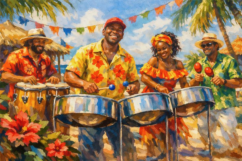 Das Gemälde zeigt vier fröhliche Menschen, die gemeinsam an einem sonnigen Strand Musik machen, lachen und farbenfrohe Sommerkleidung tragen. Zwei Männer tragen Strohhüte und die Frau trägt ein rot-gelbes Haarband. Die Gruppe spielt karibische Musik. Der Mann und die Frau spielen mit Stöcken auf Stahl-Steeldrums, der andere Mann spielt…