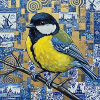 Dieses Kunstwerk fängt den robusten Charme der Kohlmeise (Parus major) vor einem Hintergrund ein, der sowohl eine Ode an die niederländische Maltradition als auch an die dekorative Opulenz des Jugendstils ist.