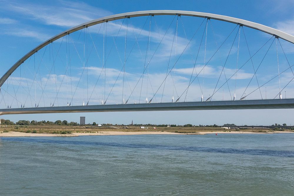 Die elegante moderne Brücke über die Waal bei Nimwegen an einem schönen Sommertag. Von der anderen Seite gesehen, wie die meisten Bilder.