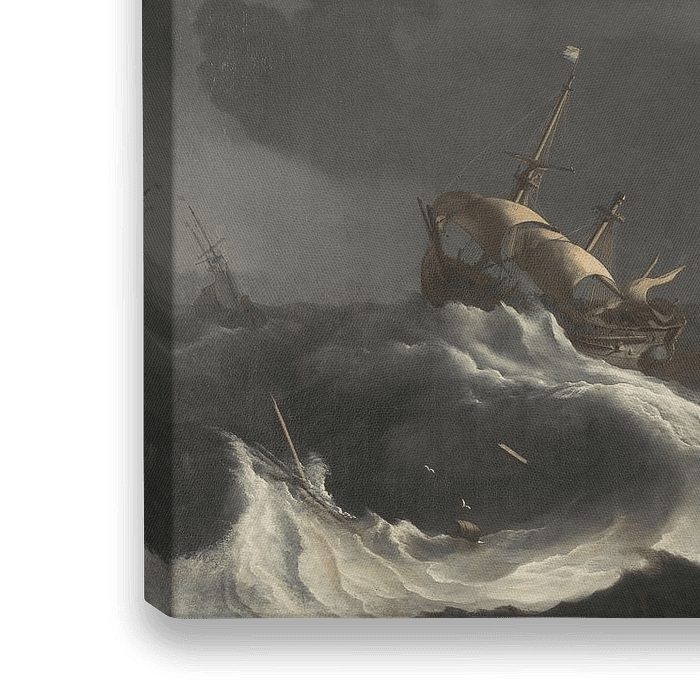 Bestelle Die Kriegsschiffe Ridderschap und Hollandia im Sturm in der Straße von Gibraltar, Ludolf Bakhuysen als Reproduktion auf Leinwand, Alu-Dibond, als Poster, Fototapete oder Acrylglasbild.