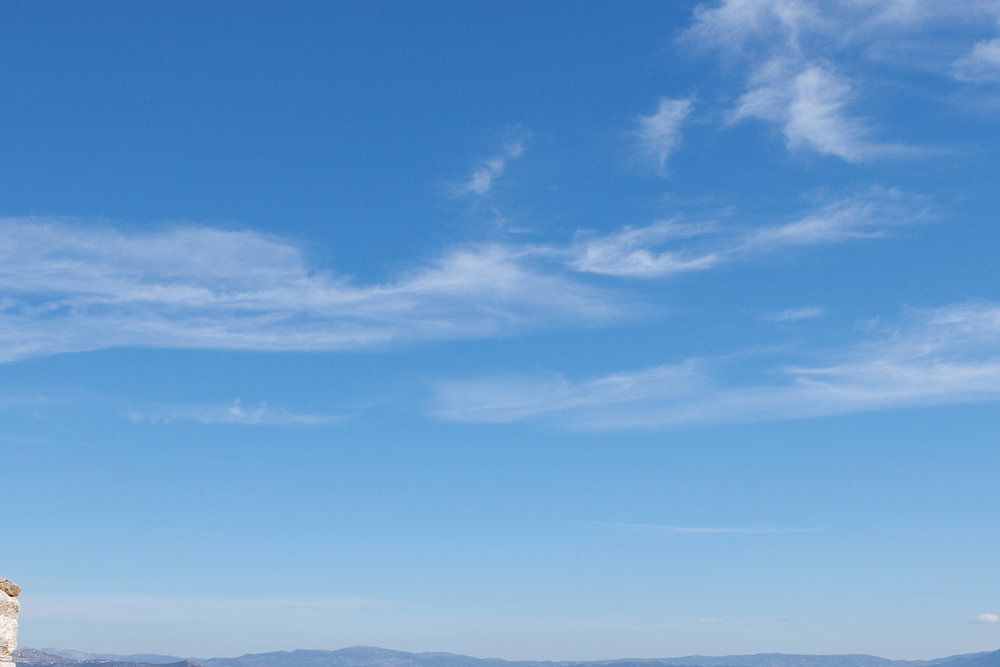 Tief blaues Meer und viel blauer Himmel ein paar Federwolken, dazu ein sandfarbener Weg.