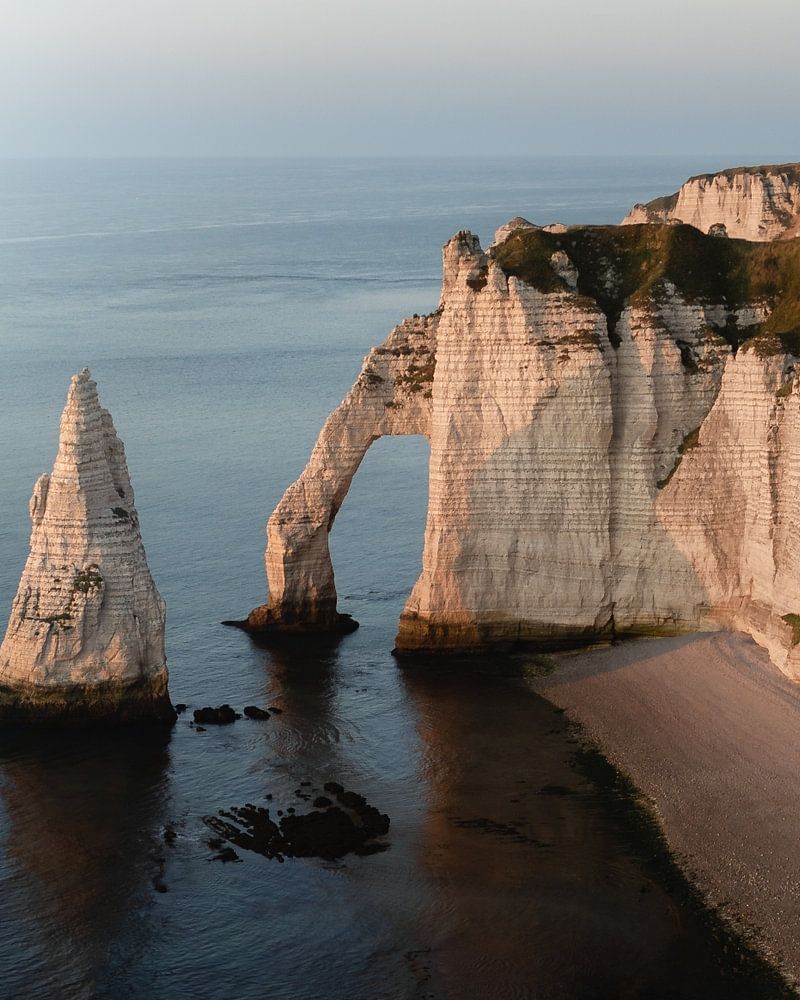 Kurz vor Sonnenuntergang in der Stadt Étretat. Das letzte Sonnenlicht scheint auf die außergewöhnlichen Felsen an der französischen Küste.