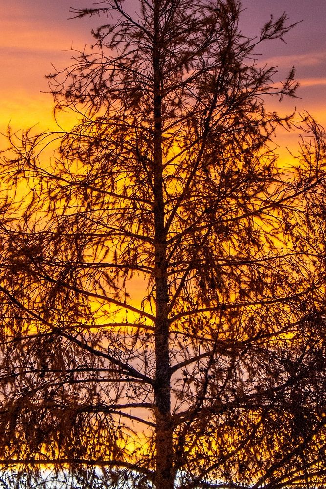 Eine Lärche zeigt sich im rötlichen Abendhimmel über Radstadt im Pongau