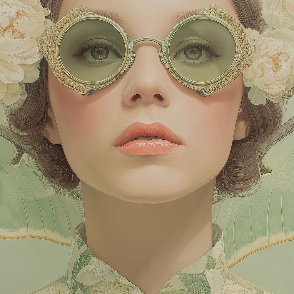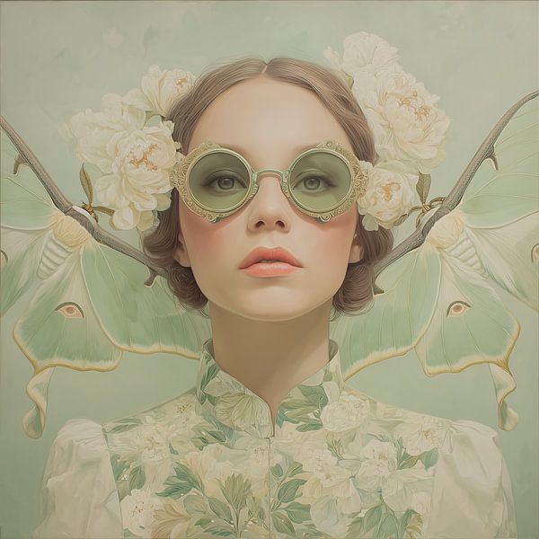 Eine junge Frau schaut dich direkt an, während hinter ihr die Flügel zweier Motten zu sehen sind. Ihre runde Brille und ihre blumige Kleidung verschmelzen in sanften Grüntönen, sodass sie fast eins mit ihrer natürlichen Umgebung wird. Das Bild wirkt verträumt und leicht befremdlich – als würde sie zwischen Mensch und Mythos balancieren.