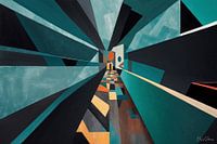 Dieses Werk ist eine Metapher für die Reise des Lebens – ein endloser Korridor, der in die Ferne führt, wo Licht und Dunkelheit miteinander ringen. Die langen, scharfen Linien in Türkis- und Petroltönen ziehen den Blick des Betrachters unaufhaltsam in die Tiefe, während die geometrischen Flächen den Boden wie ein Kaleidoskop aus…