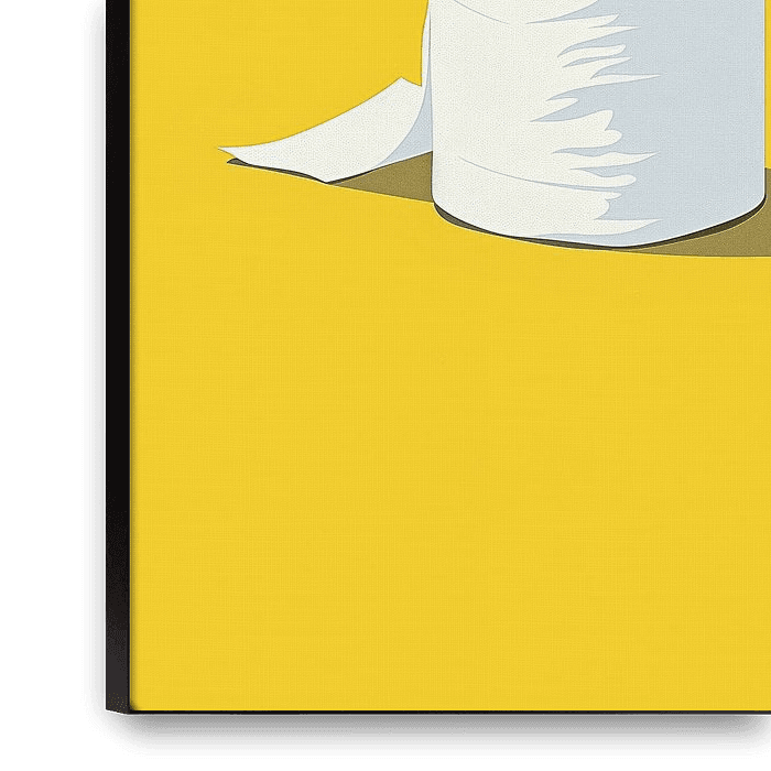Dieses Werk zeigt etwas Alltägliches auf eine Art und Weise, die sofort ein Lächeln hervorruft: eine einfache Rolle Toilettenpapier, vergrößert zu ihrem Protagonisten. Das minimalistische Bild und die kräftige Farbwahl verleihen diesem Alltagsgegenstand plötzlich Charakter. Der helle, warme gelbe Hintergrund schafft eine frische und…