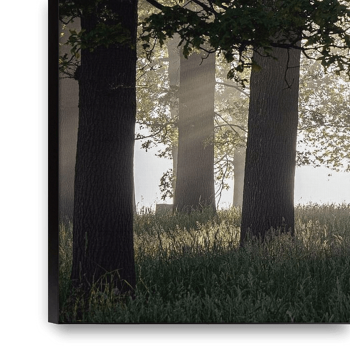 Bestelle das Foto Die Ruhe eines Waldes in Nebel und aufgehender Sonne von Affect Fotografie als Reproduktion auf Leinwand, Alu-Dibond, als Poster, Fototapete oder Acrylglasbild.
