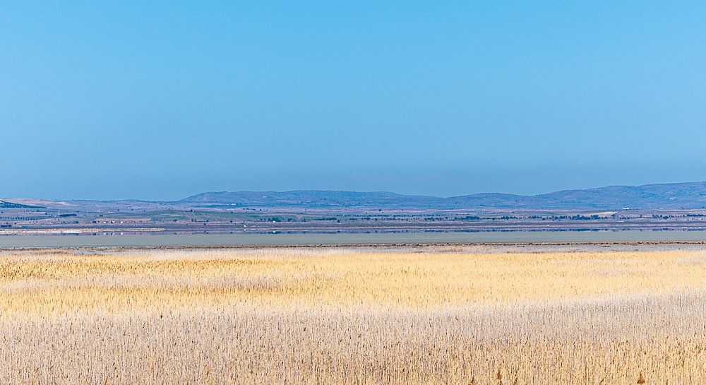 Die Salzseen von Afyonkarahisar mit schneebedeckten Berggipfeln im Hintergrund.