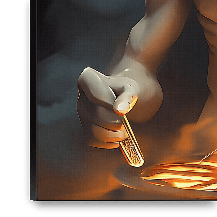 Dieses digitale Kunstwerk ist eine faszinierende Verschmelzung von Mythologie und Meisterschaft und zeigt einen gottgleichen Alchemisten auf dem Höhepunkt seines Könnens. Mit intensivem Blick manipuliert er akribisch geschmolzene Energie, wobei er Wissenschaft und Magie in einem uralten Ritual der Schöpfung miteinander verbindet. Das…