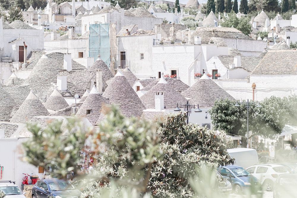 Genießen Sie die Schönheit von Alberobello. Zwischen den spitzen Dächern der Trullis kann man einen Blick auf den örtlichen Olivenhain erhaschen.