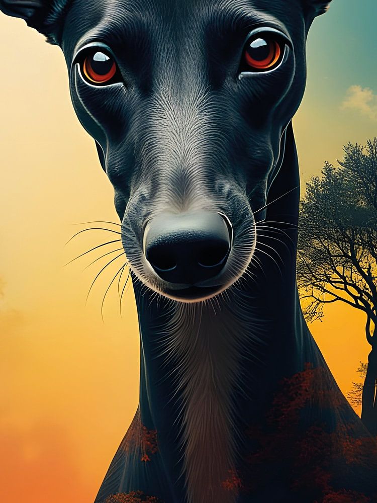 Dieses Porträt zeigt einen schwarzen Windhund / Galgo in einer ruhigen, fast verträumten Umgebung. Die schlanke Gestalt des Hundes und sein aufmerksamer Blick bilden einen schönen Kontrast zu der sanften, malerischen Landschaft, die auf subtile Weise in das Bild übergeht. Warme Orange- und Goldtöne erinnern an einen Sonnenauf- oder…