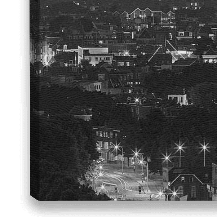 Ein 3:1-Panoramafoto in Schwarz-Weiß eines Abends mit der Skyline der Stadt Groningen und Ansichten des Stadtzentrums mit den Martinitoren, die das Bild pontisch ausfüllen.