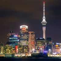 Sonnenuntergang und Blick auf die Skyline von Auckland von Devonport aus gesehen, mit dem Sky Tower, dem höchsten freistehenden Gebäude der südlichen Hemisphäre.