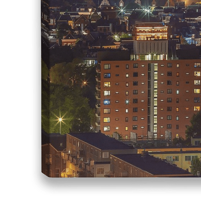 Die Stadt Groningen im Norden der Niederlande während der blauen Stunde an einem Sommerabend mit Blick auf das Stadtzentrum vom Tasmanischen Turm aus.