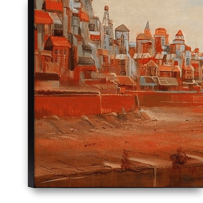 Das Gemälde enthüllt eine malerische mittelalterliche Stadt, eingefangen in warmen Brauntönen, die an den Farbton von Sandstein und Sepia erinnern. Der Fluss, der durch das Bild fließt, spiegelt die Himmelsfarben wider und schafft eine friedliche Atmosphäre.