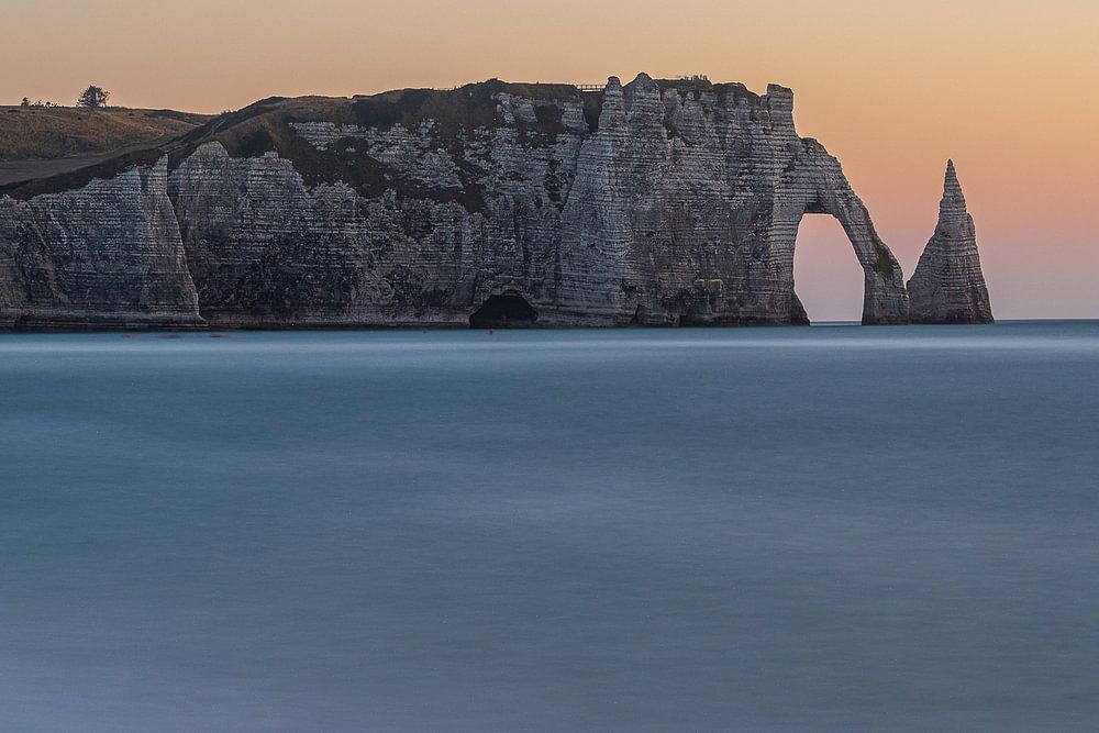 Die Felsen von Etretat, auch der Elefant genannt. Ein Foto mit langer Belichtungszeit während der blauen Stunde