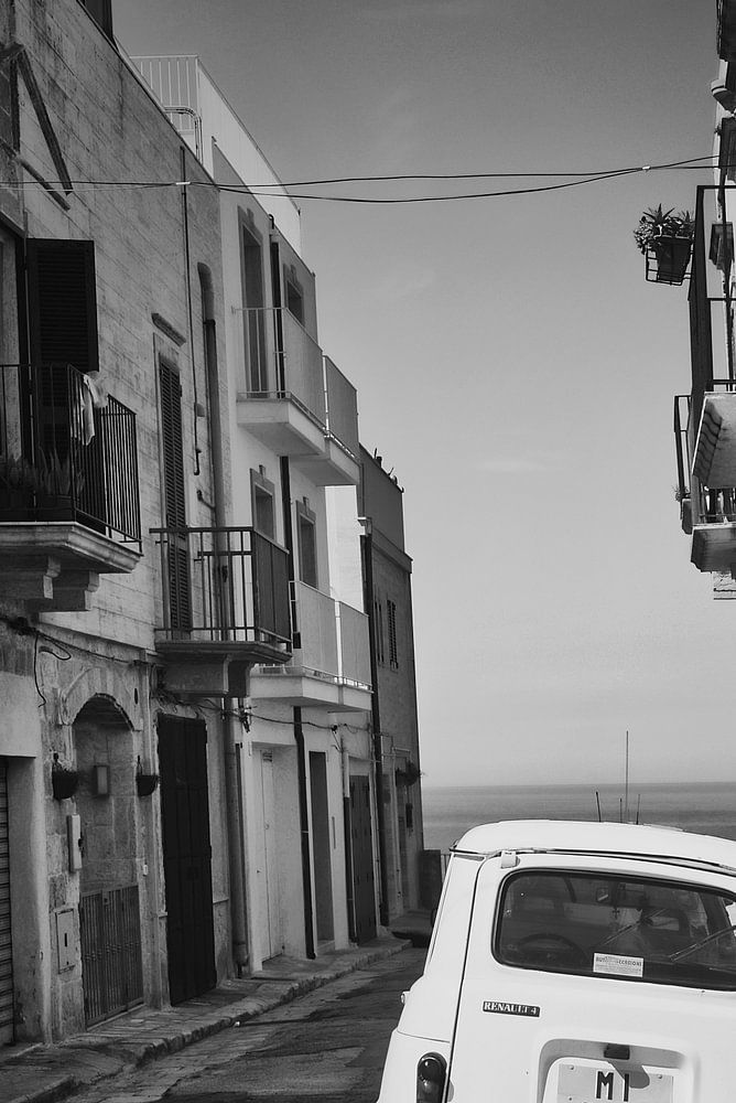 Ein alter Renault 4 in einer Sackgasse in Richtung Meer in Polignano a Mare in Apulien in Italien in stilvollem Schwarz-Weiß. Dieses Bild ist Teil der Sammlung 'Dolce Vita'.