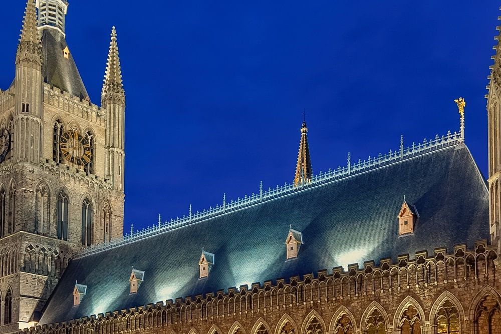 Eine Nachtaufnahme der schönen Tuchmacherhalle von Ypern Flandern in Belgien