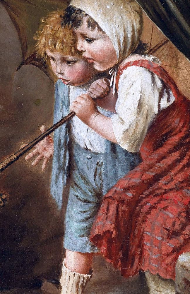Das Mädchen überrascht den Jungen, und sein Körper spricht für sich selbst. Die Kinder, unter Regenschirmen auf Clogs und Pantoffeln, machen einen etwas schäbigen Eindruck vom Anfang des 20.