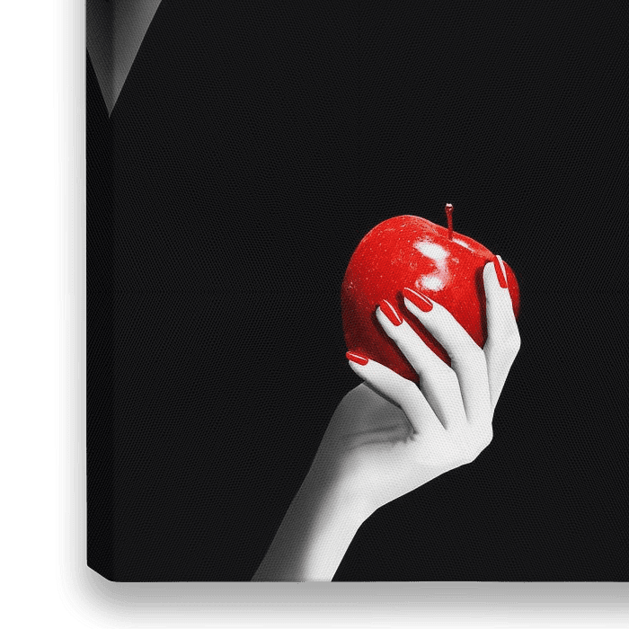 Schöne und geheimnisvolle Frau im Dunkeln mit roten Apfel. Schwarz-weiß Motif mit roten Colorkey.