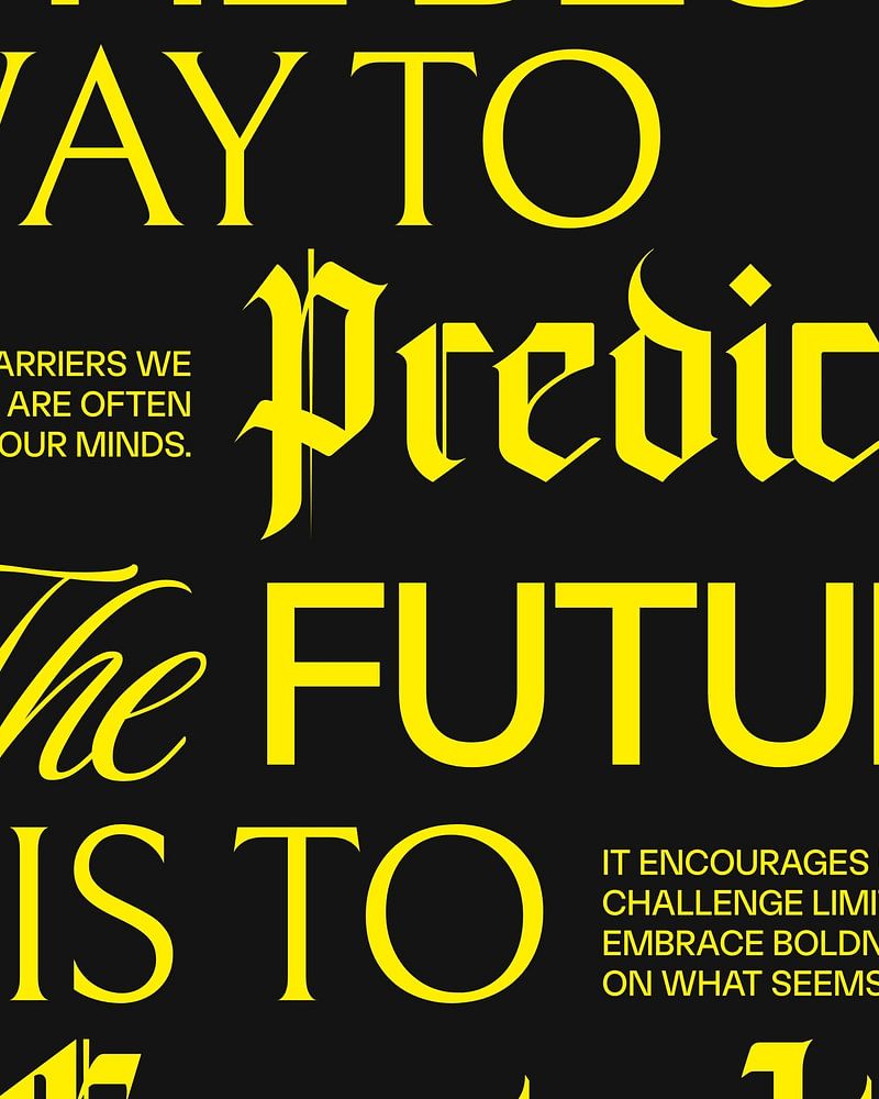 Desain tipografi motivasional dengan pesan inspiratif "Der beste Weg, die Zukunft vorherzusagen, ist, sie zu schaffen", mendorong keberanian dan kreativitas.