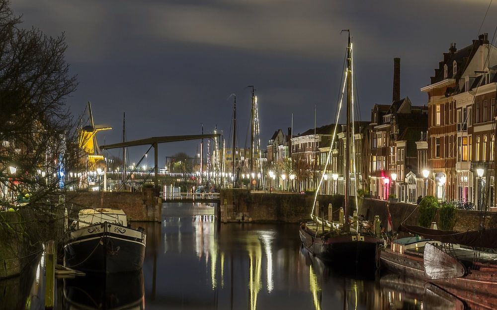 Diese alten Boote liegen leise im Wasser des alten Hafens. Im Hintergrund eine Mühle und eine Zugbrücke. Schöne Reflexion im Wasser. Dies ist ein wunderschöner alter Ort, der von Rotterdam vollständig verschluckt wird. Sehr schönes Spiegelbild, das zu Beginn der Nacht dort war.
