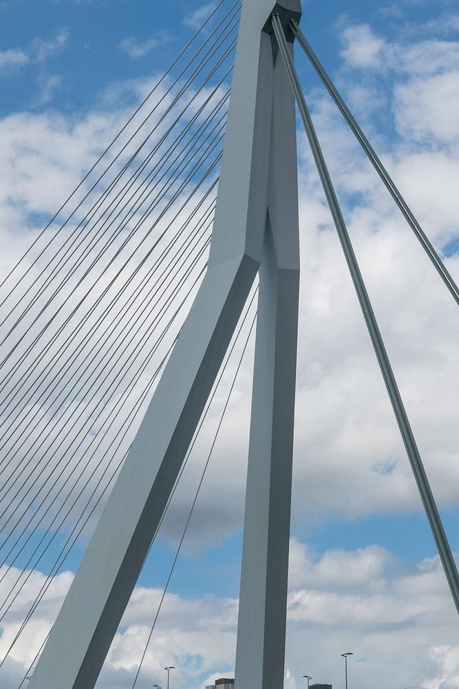 Die Erasmusbrücke in Rotterdam mit schönen Wolken im Hintergrund. Ausnahmsweise ist nicht die ganze Brücke auf dem Bild, sondern nur die charakteristische Säule.