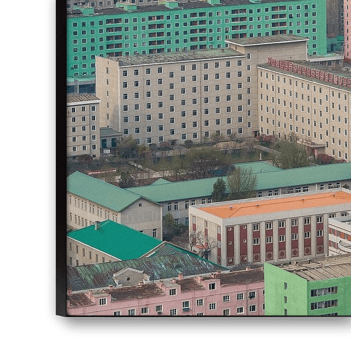 Blick über Pjöngjang vom Juche-Turm, einem der vielen Denkmäler in der Hauptstadt Nordkoreas. Die düstere Sowjetarchitektur der Stadt ist heute in bunten Pastelltönen gestrichen, was diese graue Stadt recht fröhlich wirken lässt.
