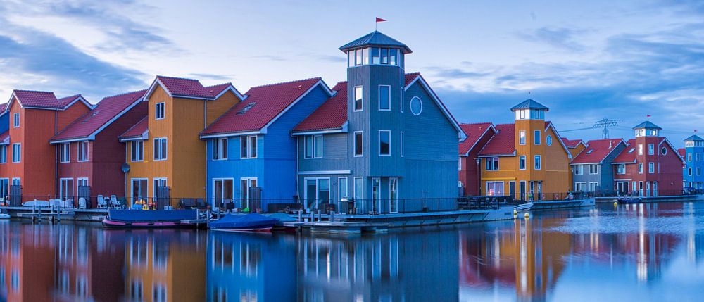 Die bunten Häuser von Reitdiephaven in der Stadt Groningen während eines schönen, ruhigen Sonnenuntergangs. Die Wolken spiegeln sich im Wasser des Hafens