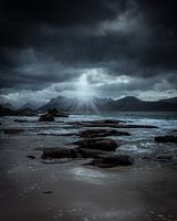 Die dunklen Wolken, die den Sturm ankündigen, vertreiben die letzten Strahlen der Sonne. Bild wurde am Strand von Vikten auf den Lofoten in Norwegen gemacht.
