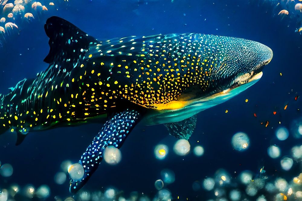 Der Walhai schwamm durch das tiefblaue Wasser des Ozeans, umgeben von einem Schwarm biolumineszierenden Meerestieren. Sie leuchteten in allen Farben des Regenbogens und umschwirrten den Walhai wie glitzernde Sternschnuppen. Der Walhai selbst strahlte eine beruhigende Aura aus, als er langsam durch das Wasser glitt.
