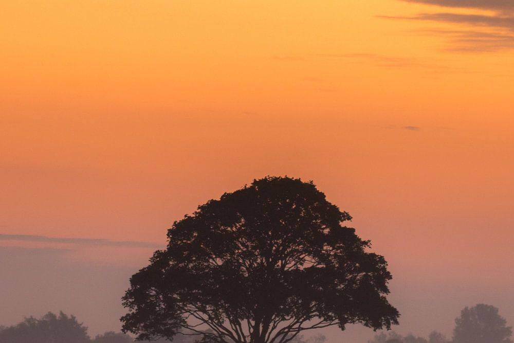 Ein einsamer Baum steht mitten in den Feldern der friesischen Landschaft. Das Foto wurde in den frühen Morgenstunden aufgenommen. Am Himmel sind wunderschöne Orangetöne zu sehen.