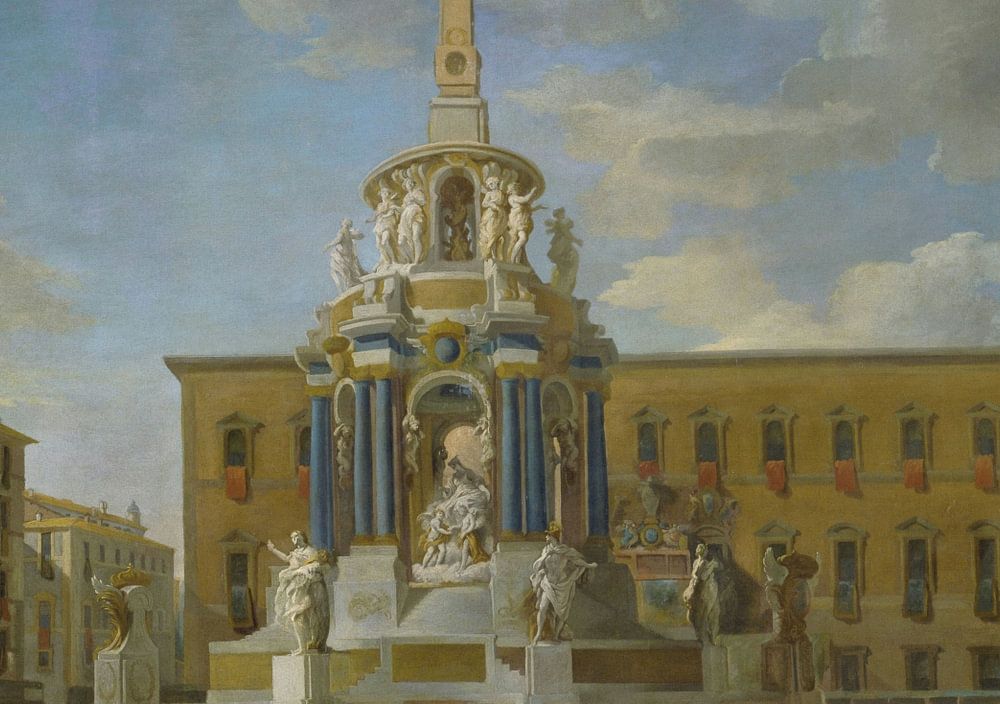 Der phantasievolle Tempel in der Mitte dieses Gemäldes scheint so dauerhaft zu sein wie die Gebäude, die ihn umgeben. In Wirklichkeit handelte es sich um ein provisorisches Bauwerk aus Gips und Brettern, das dazu bestimmt war, sich in einem Feuerwerk selbst zu zerstören. Europas Städte dienten oft als Schauplätze für aufwendige Feste, mit denen die herrschenden Eliten gefeiert wurden. Giovanni Paolo Paninis Gemälde dokumentiert die Festlichkeiten, die von der Hochzeit des französischen Thronfolgers Ludwig im Jahr 1745 inspiriert wurden. Es zeigt auch stolz das eigene Werk des Künstlers als Designer. Neben großartigen Stadtansichten wie dieser war Panini auch für seine Festdekorationen und Feuerwerke berühmt. Der hier abgebildete Tempel wurde nach seinen eigenen Plänen gebaut.