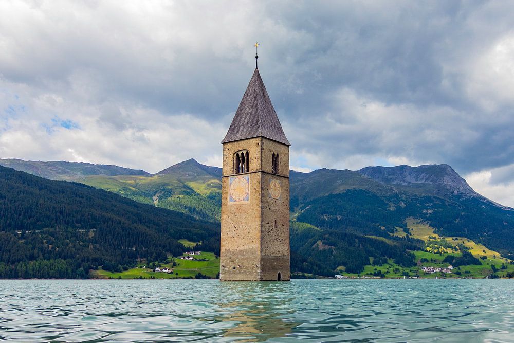 Der Reschensee, im italienischen Reschensee, ist ein Stausee in der Südtiroler Gemeinde Graun. Es wurde 1950 nach dem Bau eines Damms zwischen 1948 und 1950 gegründet. Lediglich der Glockenturm von Graun durfte als historisches Wahrzeichen erhalten bleiben.