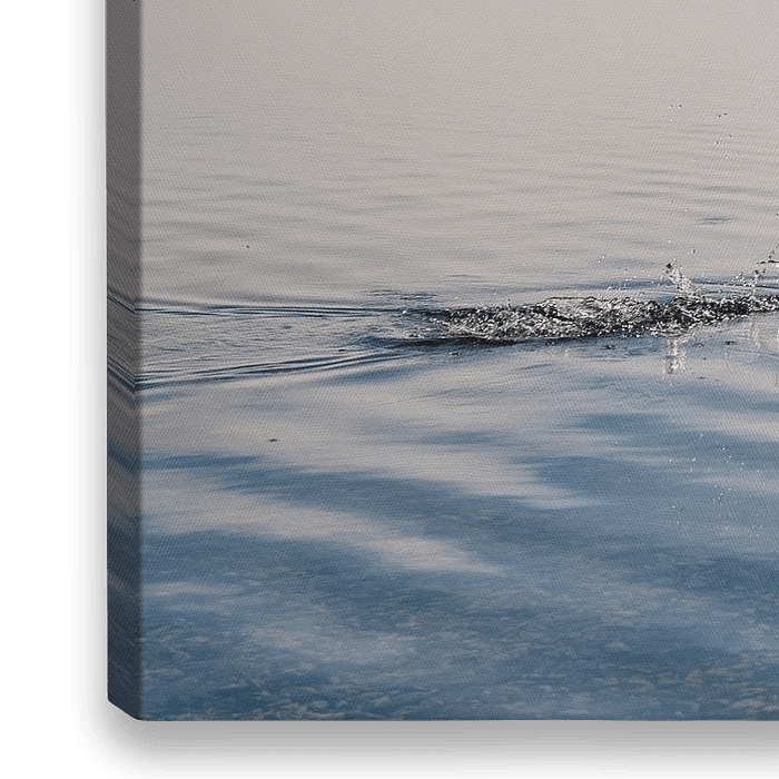 Diese Ente fliegt weg, als ich am Ufer des Brohinjer Sees auftauche. Man kann die Spritzer sehen, wenn er über das Wasser läuft. Der See ist in Nebel gehüllt, der sich zu Beginn dieses sonnigen Tages langsam lichtet.