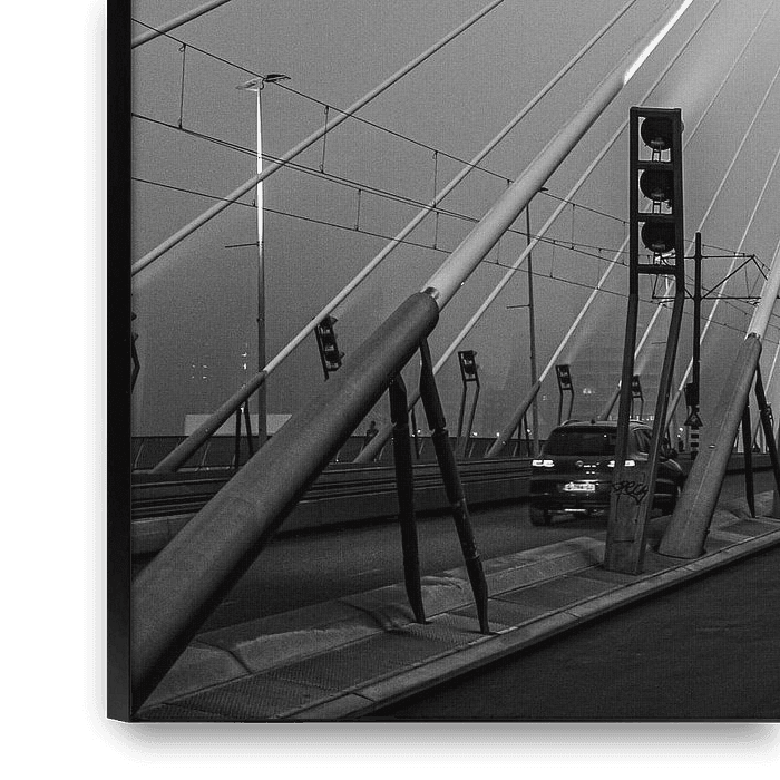 Die Erasmusbrücke in Rotterdam in einer schönen Abendstimmung. An einem kalten Abend im Februar aufgenommen. Es war ein kalter Abend und der Nebel verbarg die Erasmusbrücke teilweise im Dunst. Die Beleuchtung der Brücke verleiht dem Foto einen besonderen Charakter. Dieses lang belichtete Abendfoto passt wunderbar an die Wand in Ihrem…