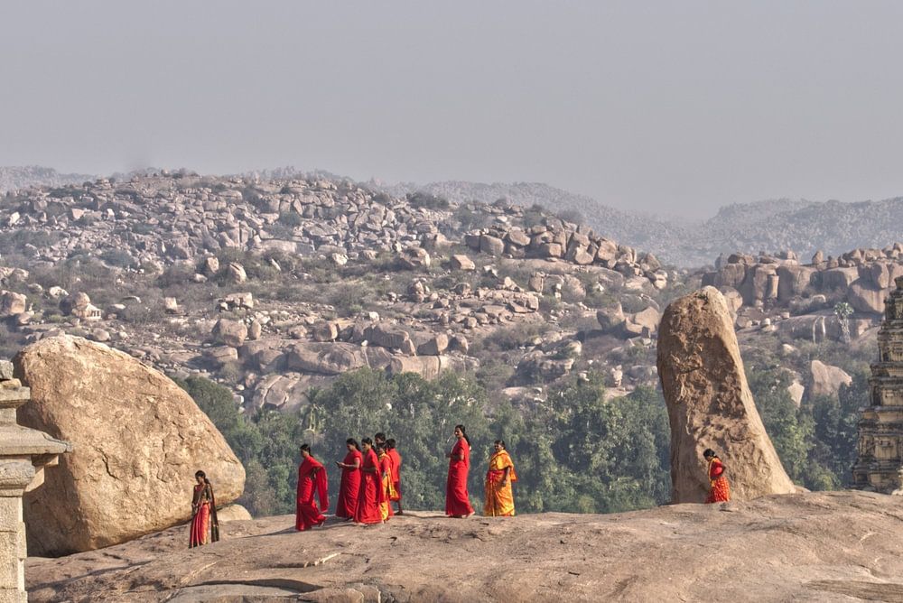 Als ich zwischen den Tempelruinen von Hampi stand und über die Landschaft blickte, war es sehr beeindruckend, diese mittelalterlichen Strukturen in der Landschaft zu sehen. Es gibt wenig auf der Welt, womit man sie vergleichen könnte. Als ich einige Minuten dort stand, tauchte plötzlich eine Familie in roter Tracht hinter einigen Felsen aus dem weiter entfernten Tempel auf. Die Frauen bewegten sich elegant in diesen wunderschönen Saris nach links und kamen einen Moment später auf uns zu. Aber dieses erste Bild ließ mich für einen Moment daran denken, dass ich mich in einer Zeit befand, in der Tempel noch mehr waren als die alten Ruinen, die sie heute größtenteils sind. Dass es zwischen den Tempeln immer Prozessionen von Priestern und Priesterinnen gab, die ihre Götter anbeteten und an den Altären Opfergaben darbrachten. Es war einer dieser Momente, auf die man als Fotograf nur hoffen kann.
