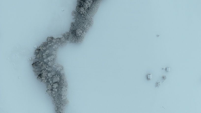 Aus der Luft eröffnet sich eine stille Winterlandschaft in Dalarna, Schweden. Ein schmaler, dicht mit Raureif bedeckter Baumstreifen schlängelt sich wie eine sanfte Linie durch ein weitläufiges weißes Feld. Die Bäume bilden einen natürlichen Kontrast zu der offenen Schneebene, die sie umgibt. In der Ferne stehen zwei kleine Hütten, fast…