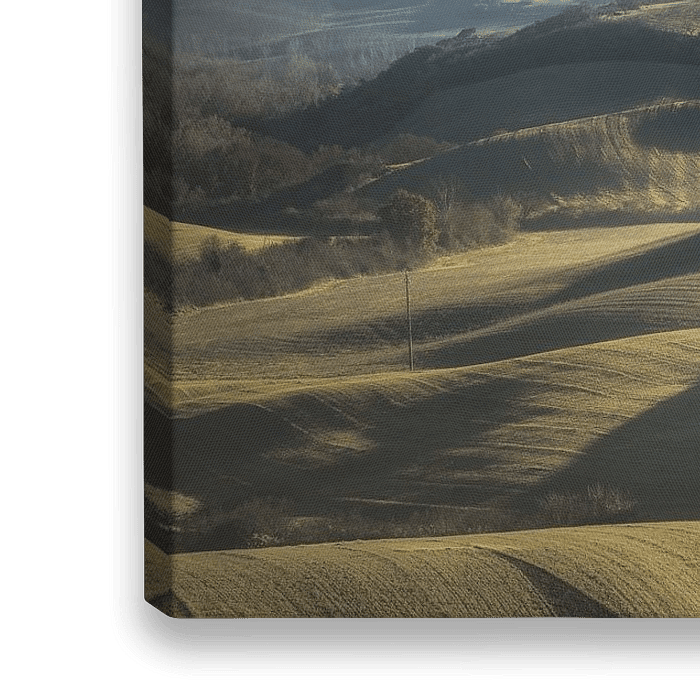 Landschaftsfotografie des Val d'Orcia, Toskana, aufgenommen an einem späten Nachmittag im Dezember 2023 in der Nähe von Pienza. Die sanften Hügel erzeugen ein weiches Muster aus Licht und Schatten, mit einem traditionellen toskanischen Bauernhaus auf dem Bergrücken. Eine klassische italienische Landschaftsszene, perfekt für Wandkunst und Inneneinrichtung.