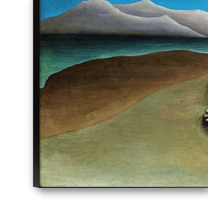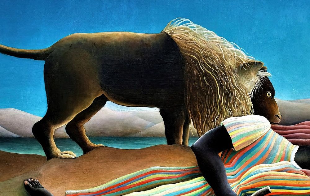 Das Gemälde zeigt die liegende Figur einer jungen Frau in einer Wüstenlandschaft, die von einem kleinen Löwen begleitet wird. Die traumhafte und fantastische Qualität des Gemäldes mit seiner surrealen Farbpalette und seinem Sinn für das Geheimnisvolle hat es zu einem der ikonischsten Kunstwerke in der Geschichte der modernen Kunst gemacht.