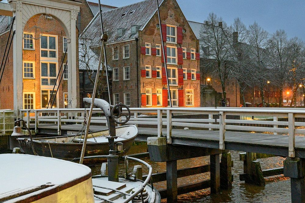 Die verschneite Thorbeckegracht in Zwolle an einem kalten Wintermorgen mit Hausbooten auf der Gracht und der Broerenkerk im Hintergrund. Die Dächer und Straßen sind mit einer dünnen Schneeschicht bedeckt.