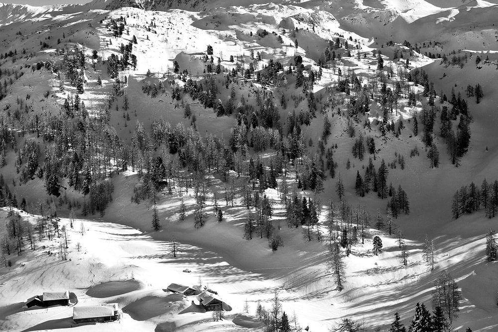 Die winterliche Südwienerhütte in schwarz weiß