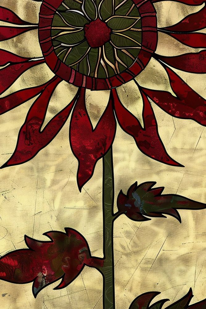Dieses atemberaubende digitale Kunstwerk einer Sonnenblume kombiniert die klassische Schönheit der Natur mit einem modernen, digitalen Touch. Die warmen Rot- und Grüntöne der Blütenblätter bilden einen schönen Kontrast zu den detaillierten Blättern und dem Stiel, während der Vintage-Hintergrund für zeitlose Eleganz sorgt. Dieses Kunstwerk eignet sich perfekt für jeden Raum, der einen Hauch von Farbe und Natur braucht, und bringt ein Gefühl von Wärme und Vitalität in Ihr Zuhause. Das Design ist vielseitig und passt sowohl in eine moderne Einrichtung als auch in einen Raum mit klassischem Dekor. Hängen Sie es in Ihrem Schlafzimmer auf, um eine beruhigende Wirkung zu erzielen, oder im Esszimmer, um eine lebendige Atmosphäre zu schaffen.