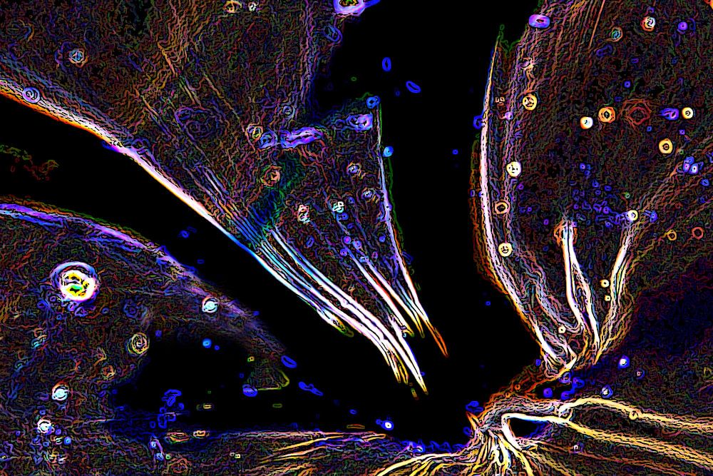 Digitale Melkweg is gemaakt met behulp van computer. Fantasie, digitalekunst met oplichtende kleurrijke kleine deeltjes in de vorm van de Melkweg. Moderne kunst uit de computer.
