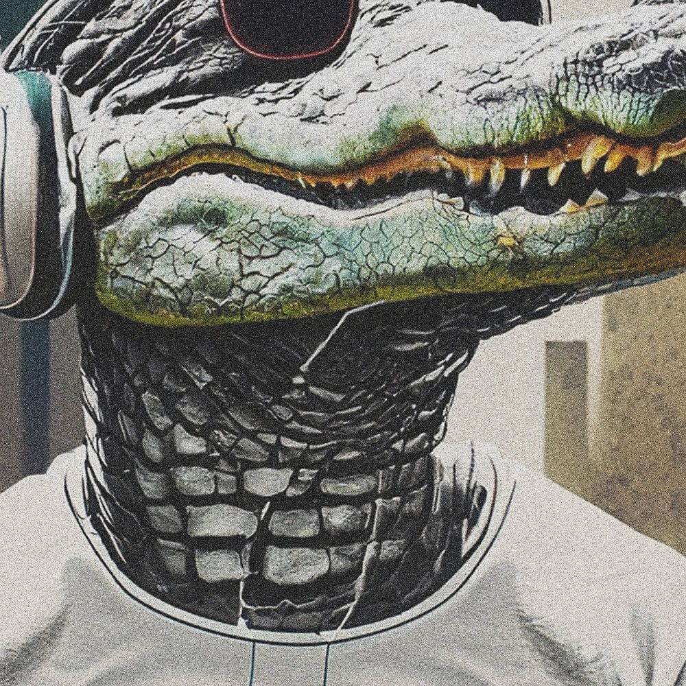 Digitales Alligator-Porträt mit Kopfhörern, Sonnenbrille und Vintage-T-Shirt. Zu Fuß in einer städtischen Umgebung. Schön für Ihr Musikstudio oder Schlafzimmer.